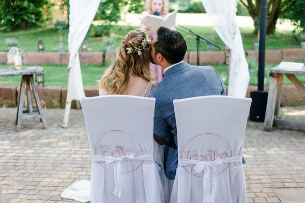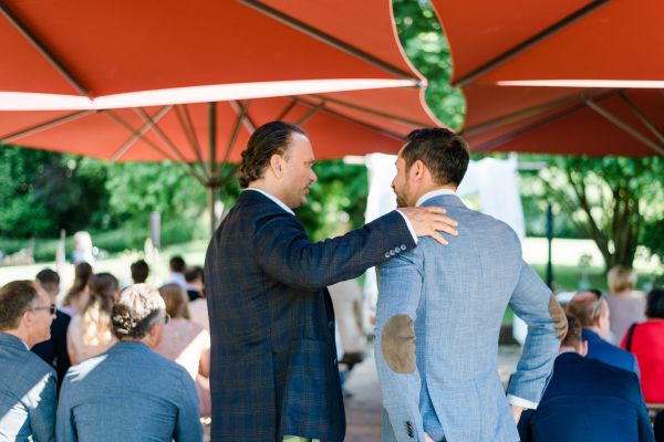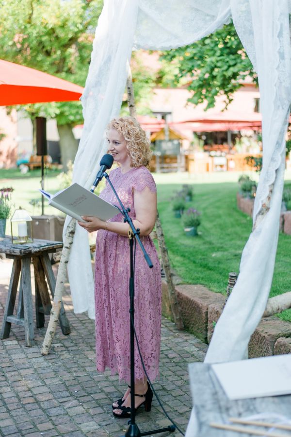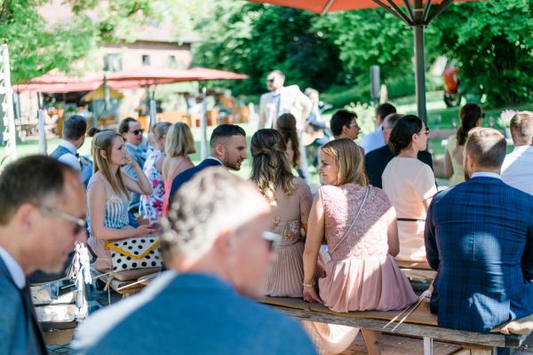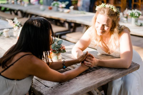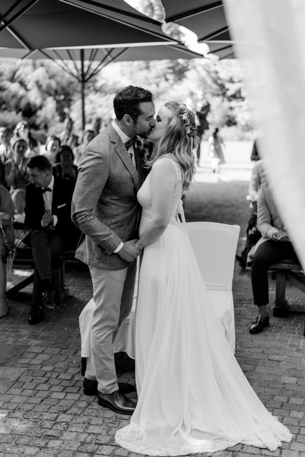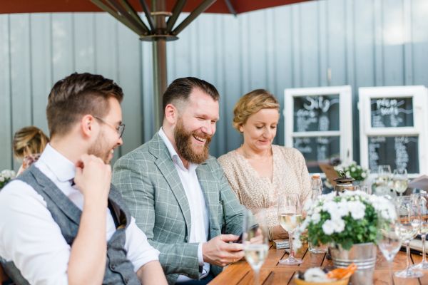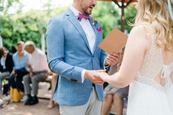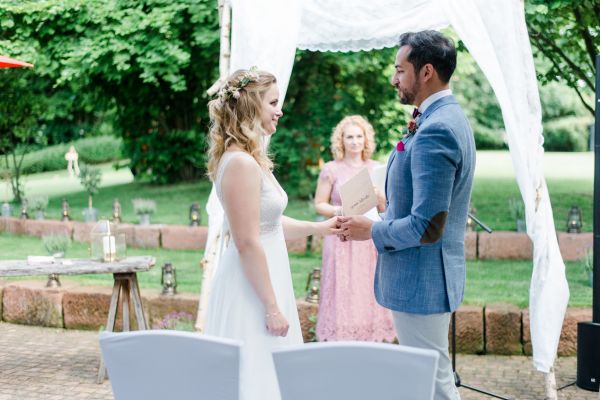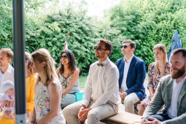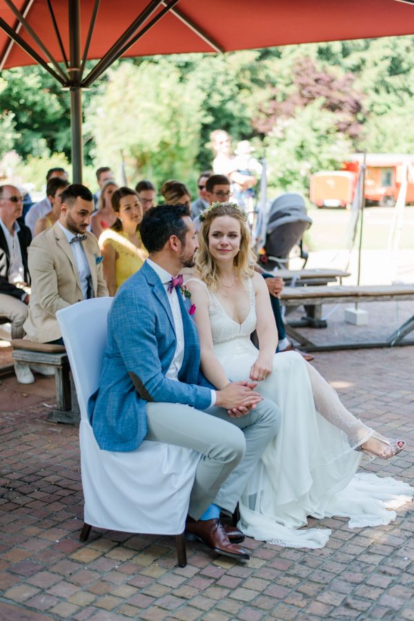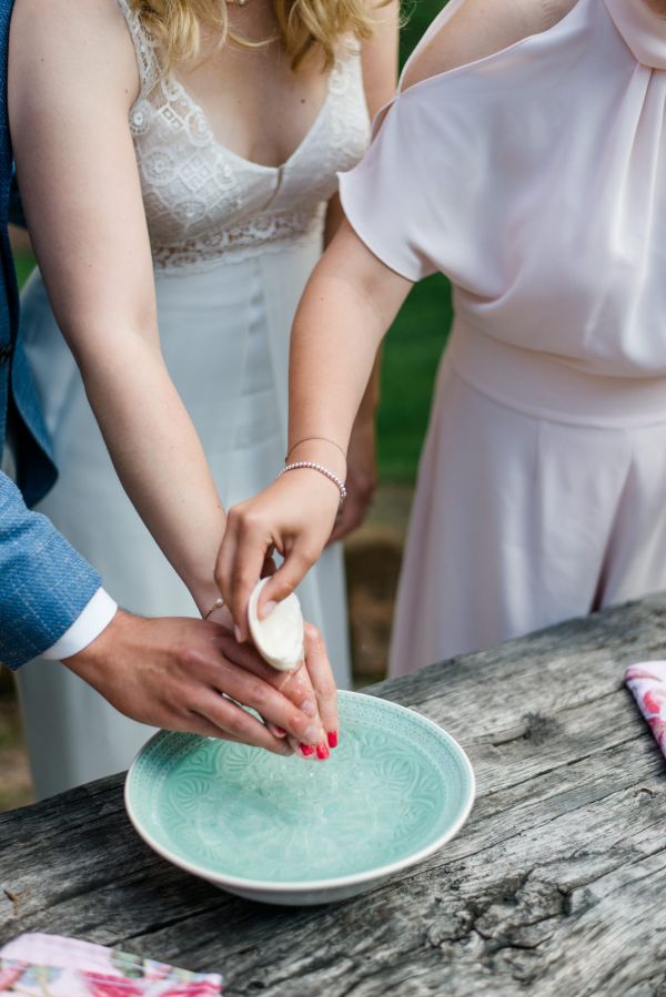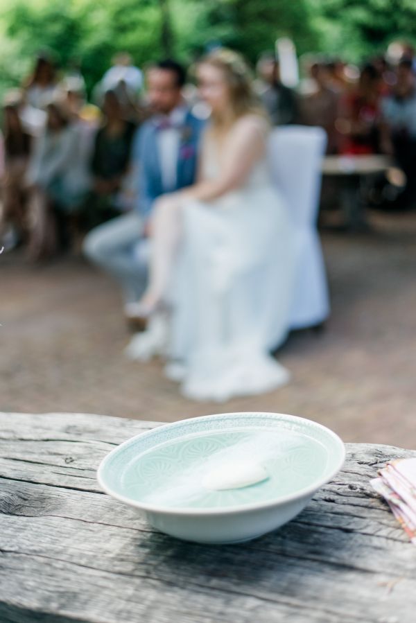 Meanwhile, Michael was out and about in the venue’s garden, preparing the final steps for the ceremony by arranging wooden tables and so on, accompanied by his best man. The free ceremony was about to be held outside by Bella, who’s just such a good and lovely soul. It was emotional, funny and overall authentic. I especially loved the personal ritual including every guest bringing a little bit of water from home (wherever they’re from) and pouring it into a bowl along with their good wishes for the bridal couple. Julia and Michael’s bridesmaid and best man then had to pour the water over the bridal couple’s hands. I had never seen this ritual before and I think its symbolism is just so beautiful and I love the fact that everyone is involved into the process!