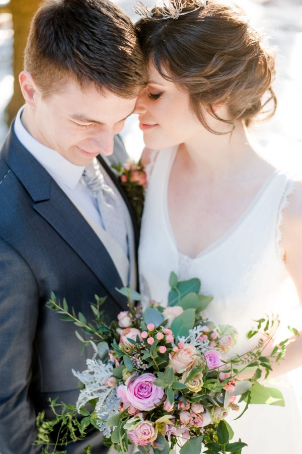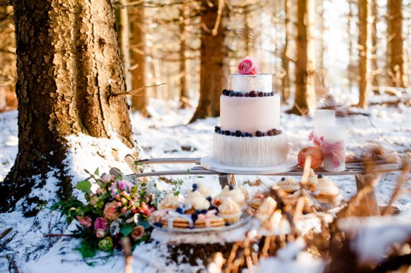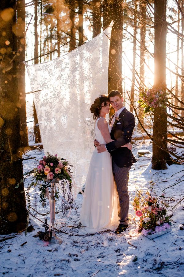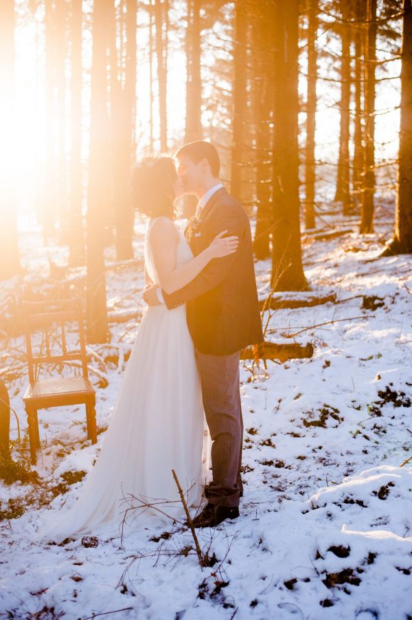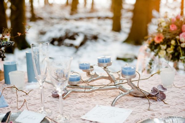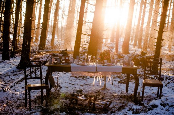 In the silence of the forest. Everything is covered with snow. Magically, the golden winter sun shines through the branches of the firs. Snowflakes are falling down from the trees, like golden rain. Colours of silver, white, rosé and blueish serenity, along with vintage furniture. And in between this beautiful scenery, a winter bride & groom. Falling in love with each other, over and over again…
