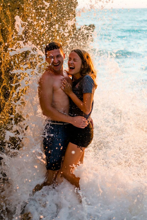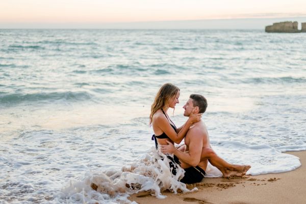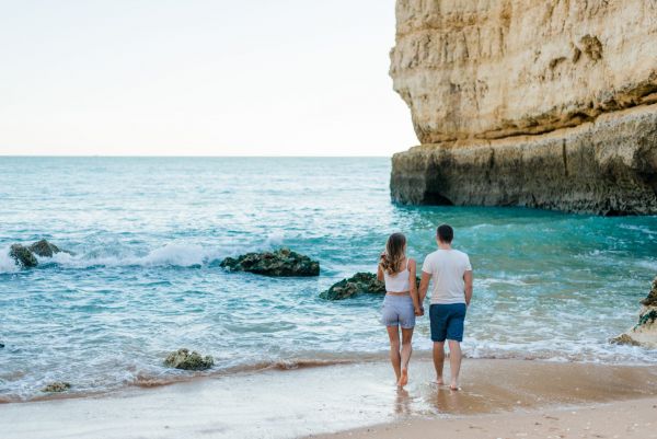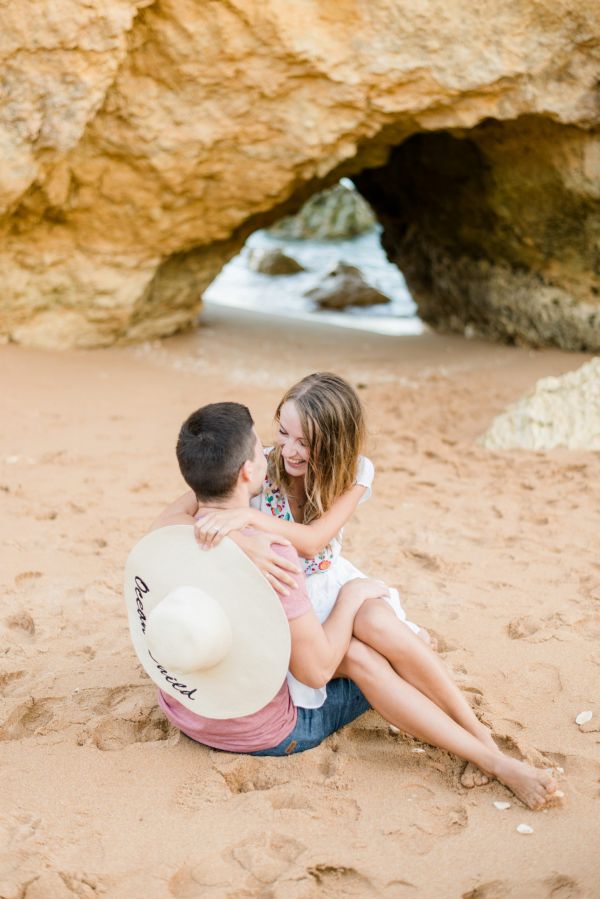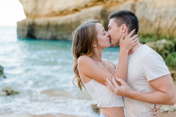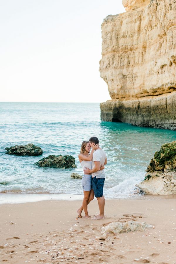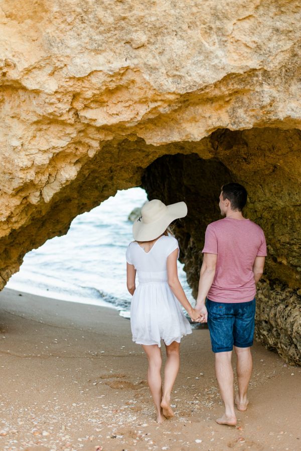 With this in mind, Kathrin, Rebecca and me wanted to have a couple session during our #unrealalgarve trip back in October 2018 to capture love and also the beauty of nature. We got to know Natascha, who’s also a photographer, and her husband Witali via instagram and they were up for a couple shoot at the beach with us – right at Praia de Coelha, a very relaxing place full of the sound of crashing waves, yellow stone cliffs shimmering in the sun and shells everywhere – the perfect place for a couple session!