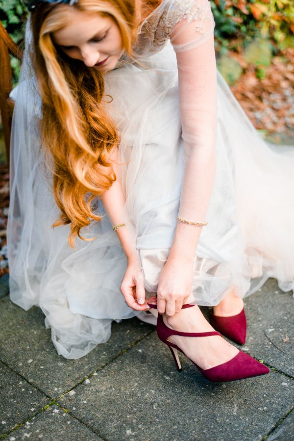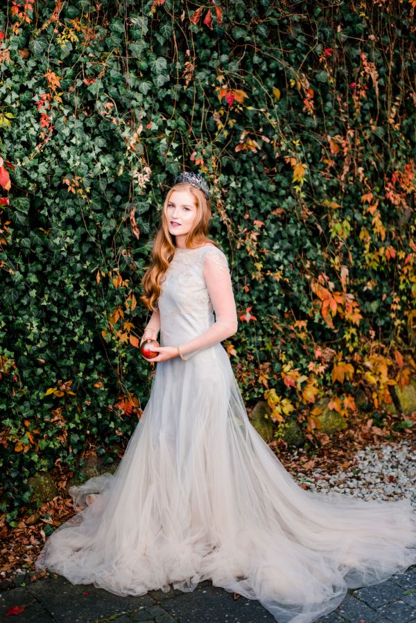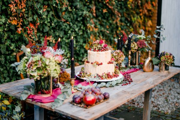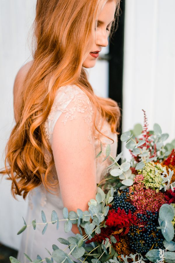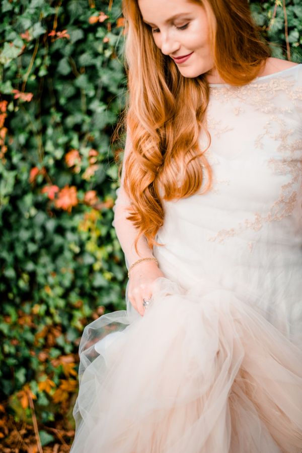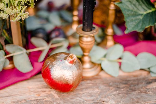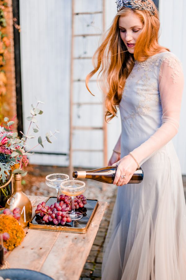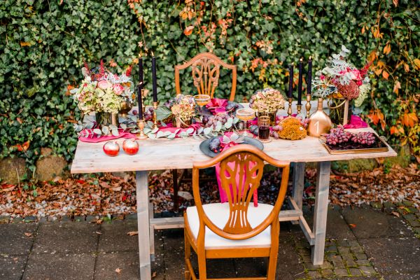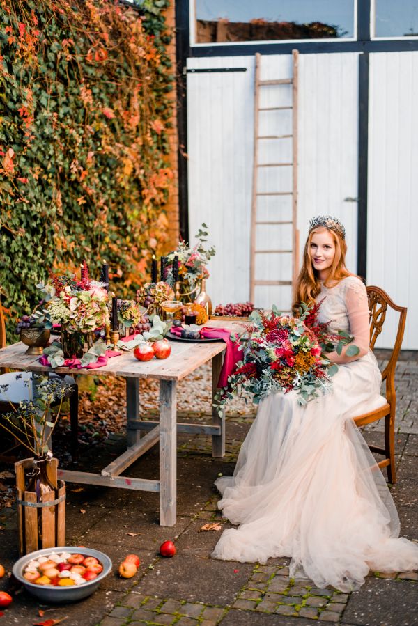 Zusammen mit tollen und talentierten Dienstleistern, die noch dazu wundervolle Menschen sind, wurde das Projekt dann Mitte Oktober bei strahlendem Sonnenschein umgesetzt. Als Location haben wir den Hof eines alten Hauses der Familie ausgewählt mit tollen Scheunentoren, Holzstühlen im Jugendstil und einer wunderschönen Wand aus Efeu, versetzt mit rotem Laub. Dort wurde das Set aufgebaut mit einem von der Floristin/Dekorateurin (Anna Tews) eigens gebautem Holztisch, auf dem u.a. üppige Blumen-Arrangements, schwarze Kerzen, mit Gold versetzte Granatäpfel und die gold-schimmernde zweistöckige Torte (Konditorei Café Zarnitz) aufgebahrt wurden. Hinzu kam die individuelle Papeterie mit verschiedenen Farb- und Faltakzenten (Herzbeschwipst by Tami Donath). Das Kleid, ein Traum in Nude/Blush mit zarten Akzenten aus Gold und einer tollen Silhouette mit leichtem Tüll (My Wony Bridal, Kollektion 2018), passte wunderbar zu unserem Model Juliette mit ihren langen naturroten Haaren. Als Hingucker-Accessoire trug sie eine wunderschön restaurierte antike Brautkrone (Polly Mc Geary) und dazu Schuhe in einem dunklen Rot-Ton (Aldo). Das herbstliche Makeup, das ganz toll auf Juliette abgestimmt war, zauberte Angelika Penner.
