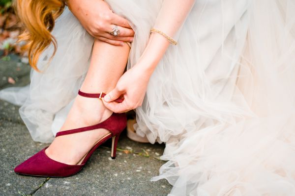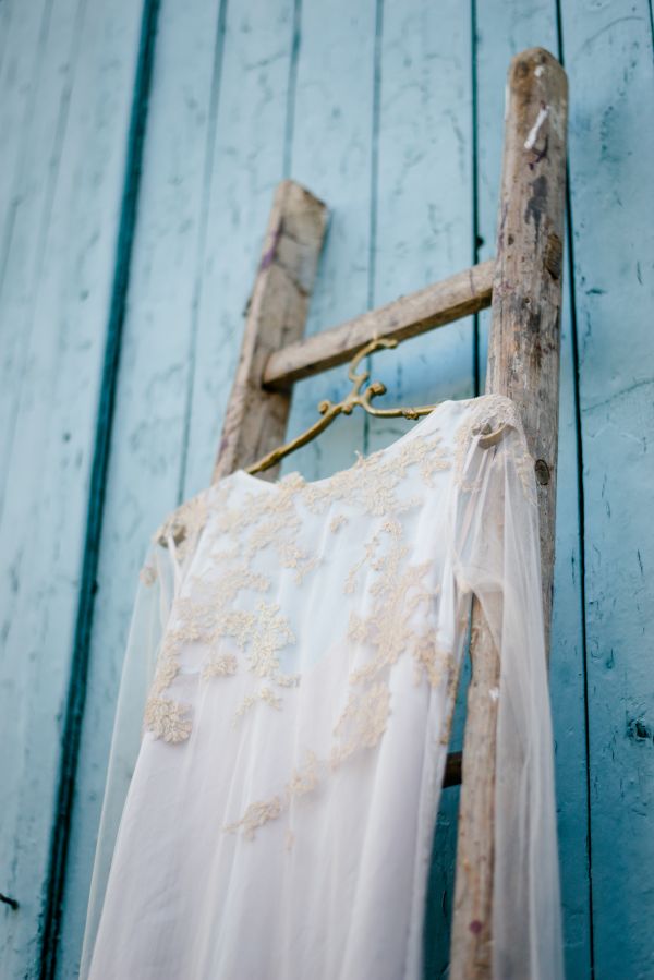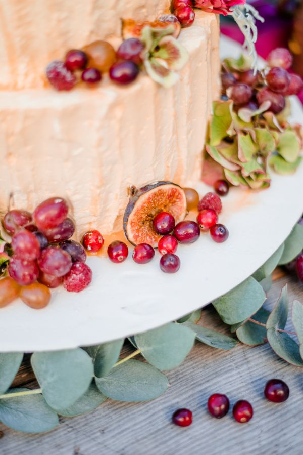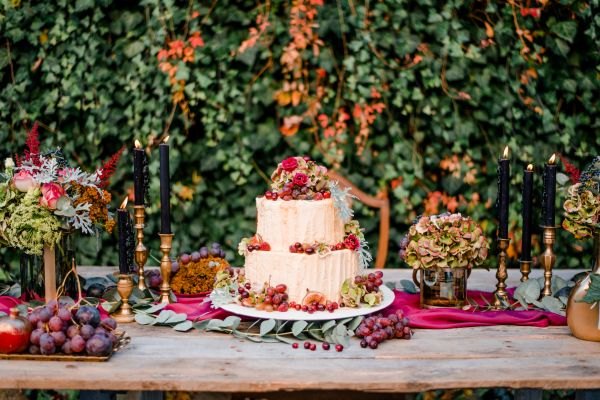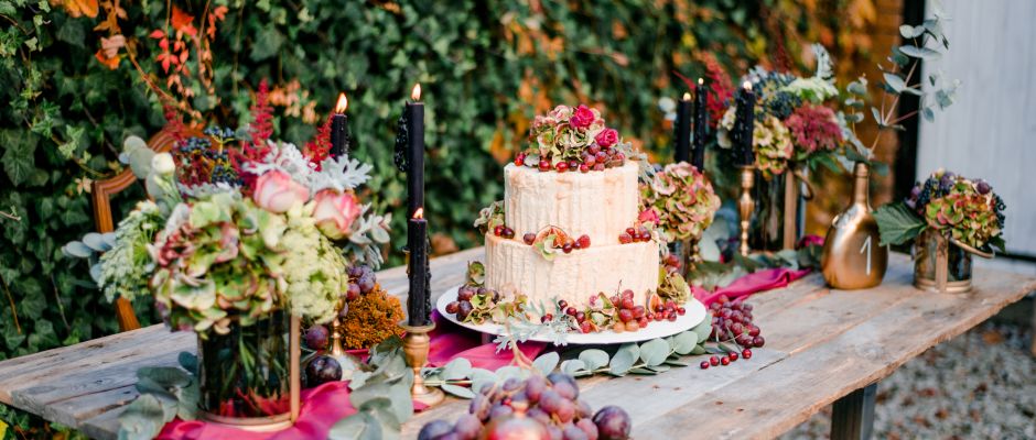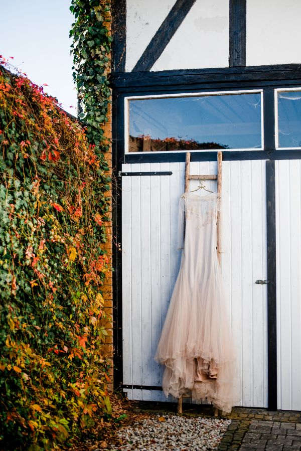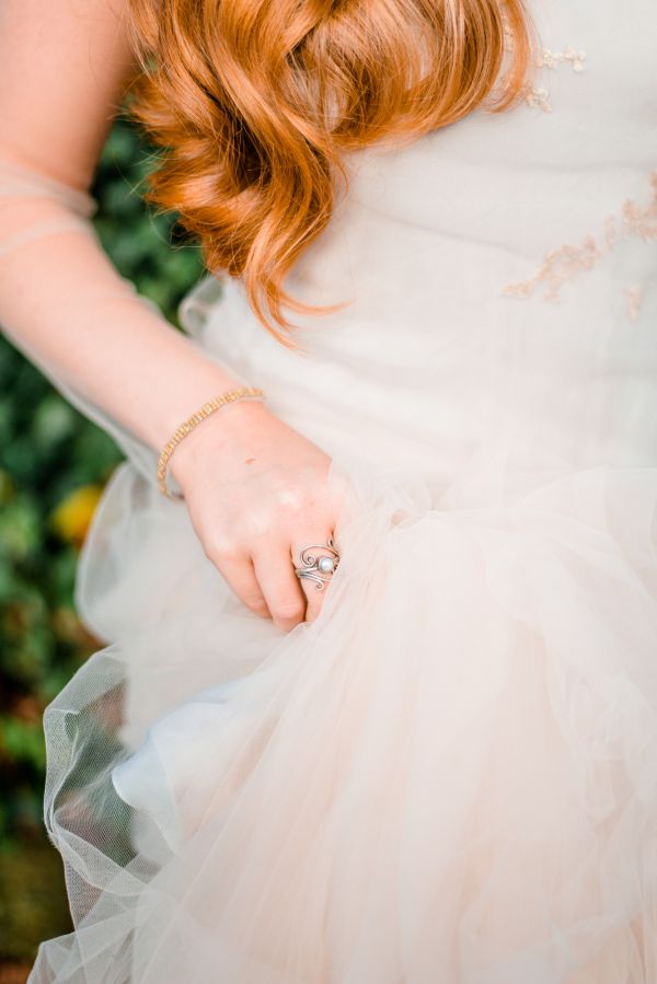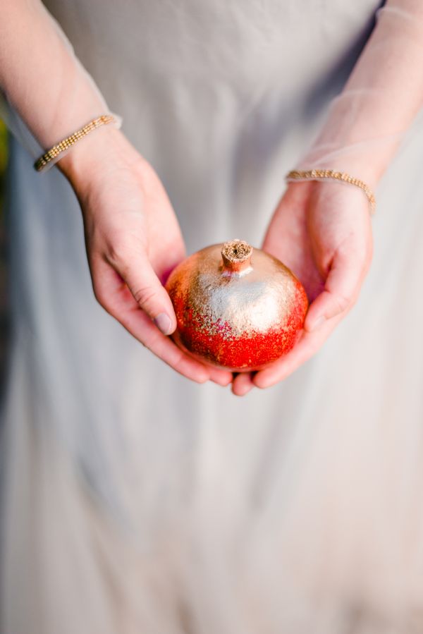 Zusammen mit tollen und talentierten Dienstleistern, die noch dazu wundervolle Menschen sind, wurde das Projekt dann Mitte Oktober bei strahlendem Sonnenschein umgesetzt. Als Location haben wir den Hof eines alten Hauses der Familie ausgewählt mit tollen Scheunentoren, Holzstühlen im Jugendstil und einer wunderschönen Wand aus Efeu, versetzt mit rotem Laub. Dort wurde das Set aufgebaut mit einem von der Floristin/Dekorateurin (Anna Tews) eigens gebautem Holztisch, auf dem u.a. üppige Blumen-Arrangements, schwarze Kerzen, mit Gold versetzte Granatäpfel und die gold-schimmernde zweistöckige Torte (Konditorei Café Zarnitz) aufgebahrt wurden. Hinzu kam die individuelle Papeterie mit verschiedenen Farb- und Faltakzenten (Herzbeschwipst by Tami Donath). Das Kleid, ein Traum in Nude/Blush mit zarten Akzenten aus Gold und einer tollen Silhouette mit leichtem Tüll (My Wony Bridal, Kollektion 2018), passte wunderbar zu unserem Model Juliette mit ihren langen naturroten Haaren. Als Hingucker-Accessoire trug sie eine wunderschön restaurierte antike Brautkrone (Polly Mc Geary) und dazu Schuhe in einem dunklen Rot-Ton (Aldo). Das herbstliche Makeup, das ganz toll auf Juliette abgestimmt war, zauberte Angelika Penner.