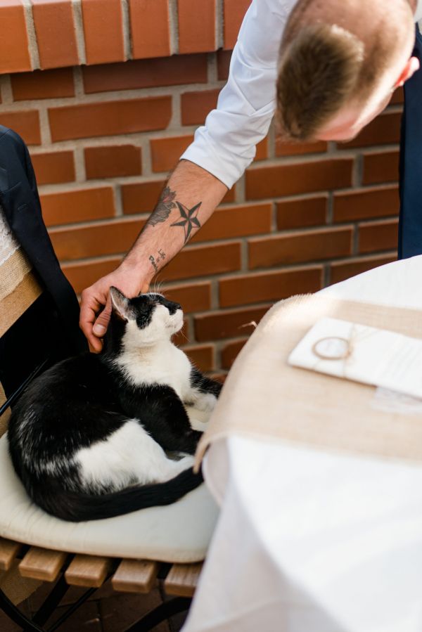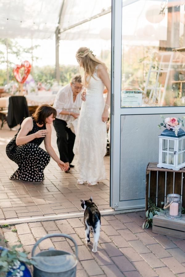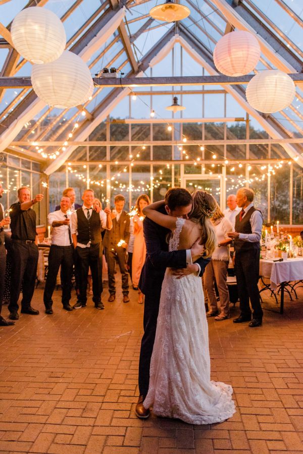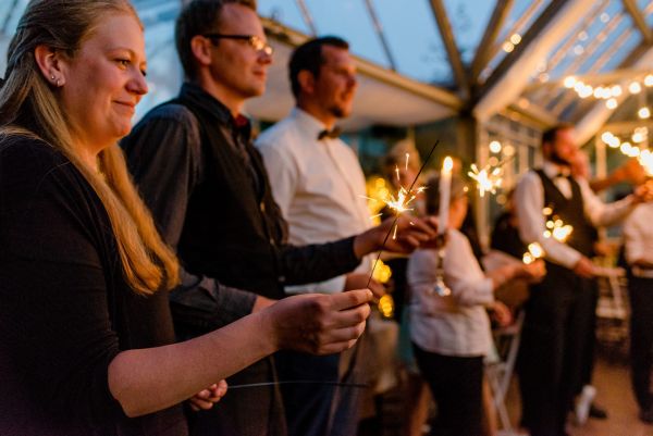 Celebrating in a greenhouse. Fairylights illuminating the huge roof of glass, shimmering like stars in the dark of the night. A dancing couple holding each other, while sparklers guide them along with the music. Furry (and feathery) friends, making me smile. Sunshine, reminding me of long summer nights. Lots of flowers and selfmade decoration, so many details, done with love. „Game of Thrones“ and „The Lord of the Rings“ soundtracks playing. Friends and family, laughing and celebrating together with the bride & groom. A bridal couple that couldn’t be happier. These are the ingredients for a perfect wedding!