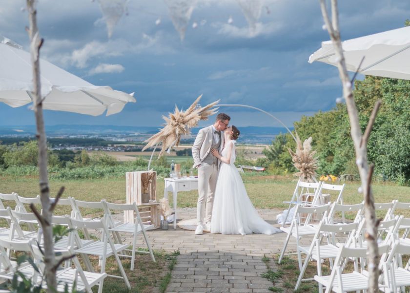 Eine freie Trauung vor einem dramatisch dunklen Gewitterhimmel. Wunderschöne Deko mit Gold und Greenery in einem rustikal-gemütlichen Hof (Hofcafé „Altes Zollhaus“ in der Nähe von Limburg an der Lahn). Ganz entspannte Gäste, Eis am Stiel