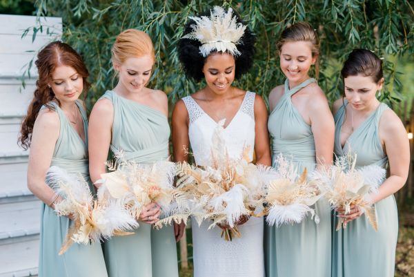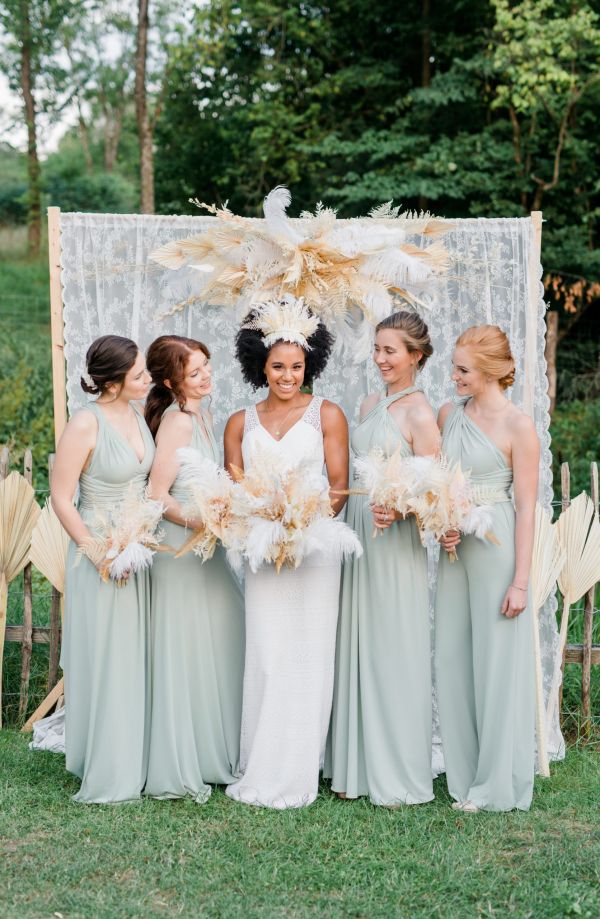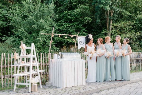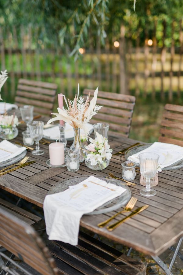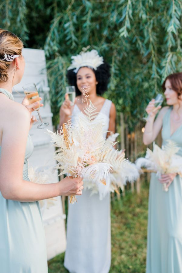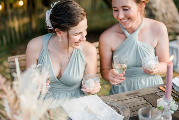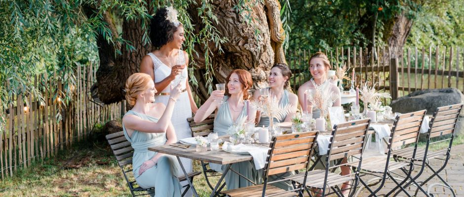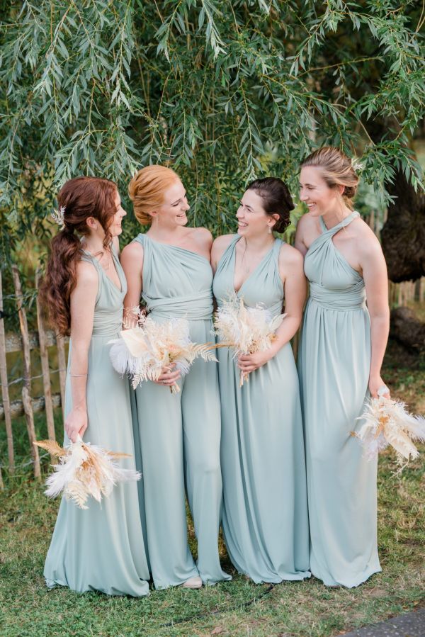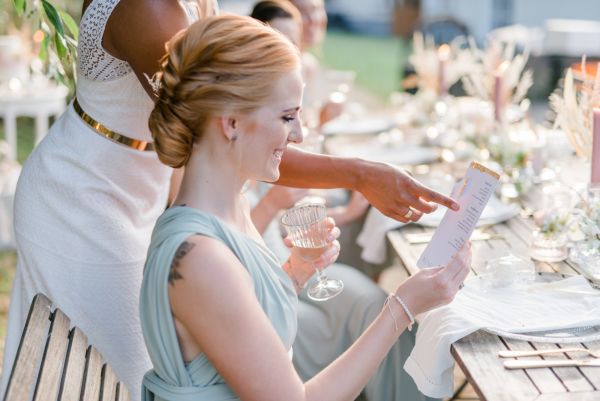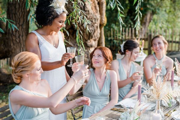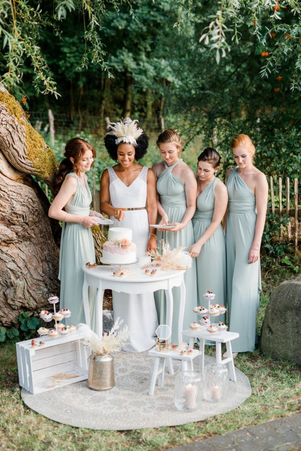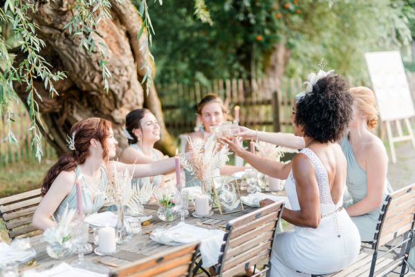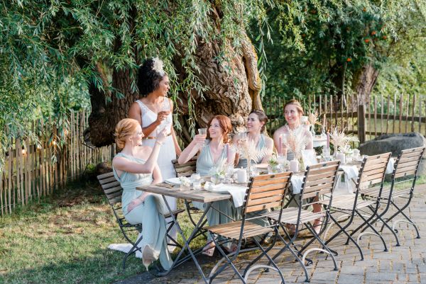 Set outside beneath an old willow tree, the lusly decorated wedding table forms the perfect backdrop for the four bridesmaids and the bride to enjoy the wedding. The soft colour palette, which consists of tones of nude, blush, gold and mint, expresses a happy and feminine atmosphere.