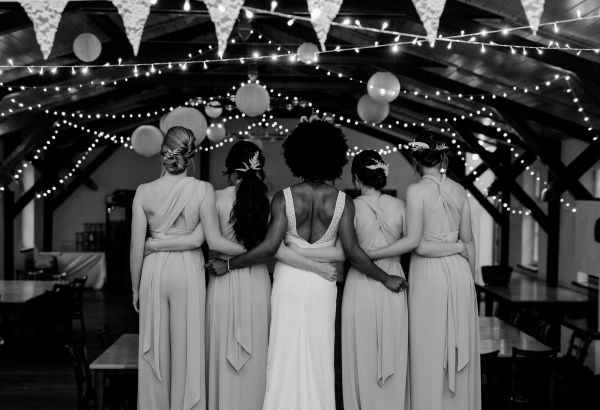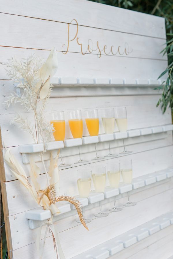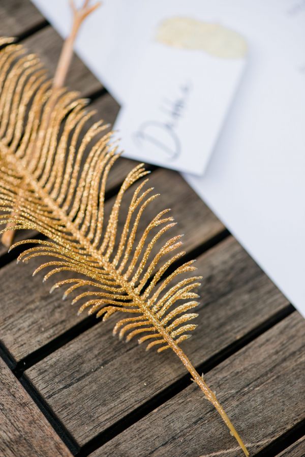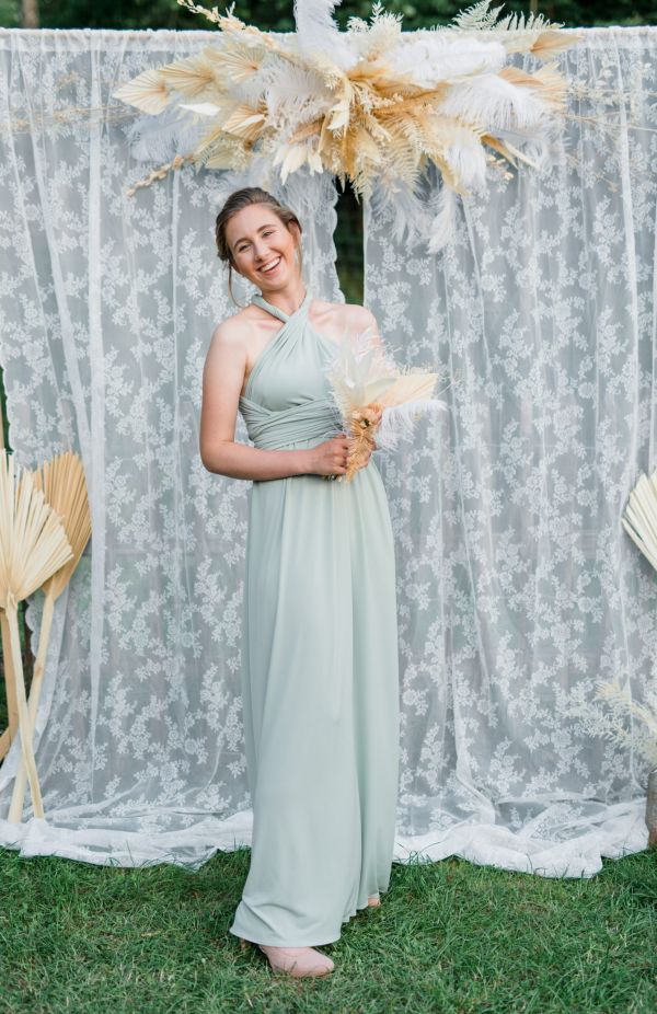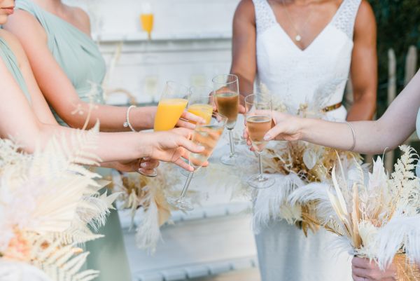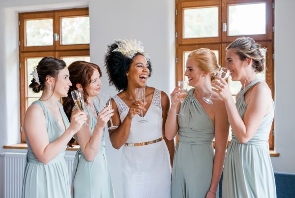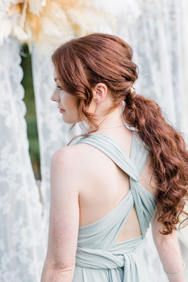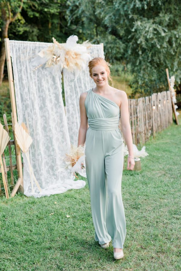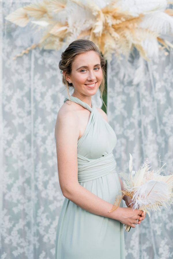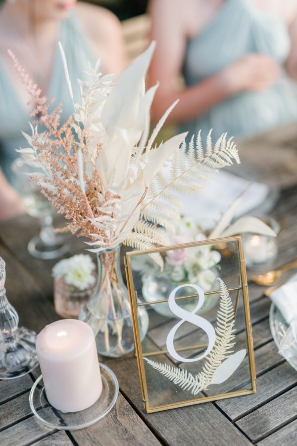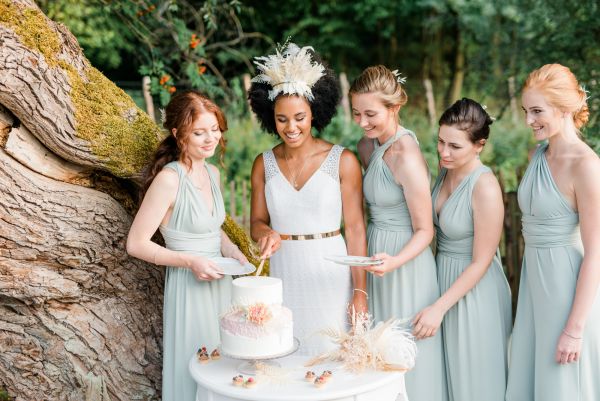 Set outside beneath an old willow tree, the lusly decorated wedding table forms the perfect backdrop for the four bridesmaids and the bride to enjoy the wedding. The soft colour palette, which consists of tones of nude, blush, gold and mint, expresses a happy and feminine atmosphere.
