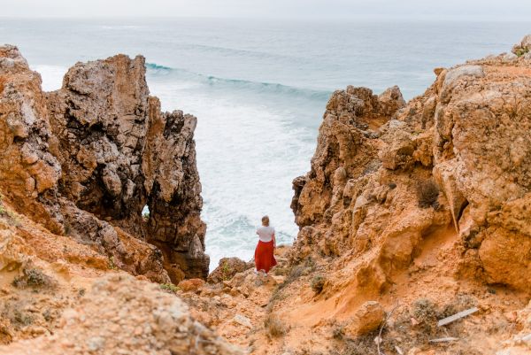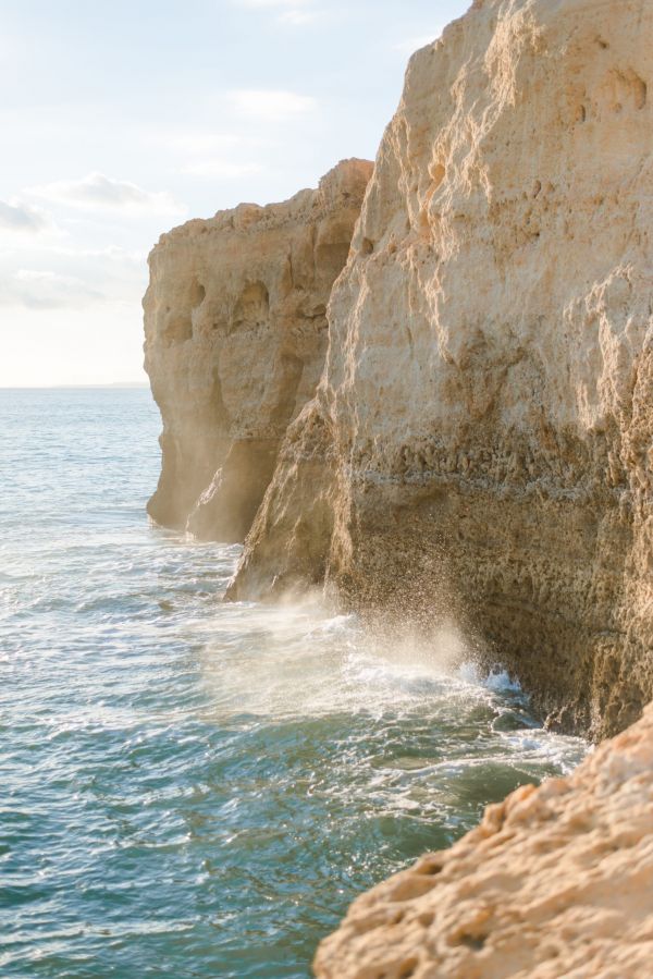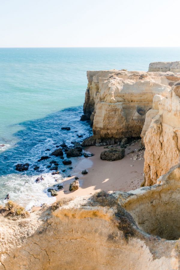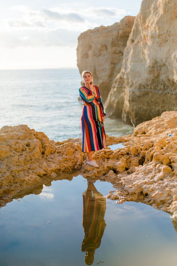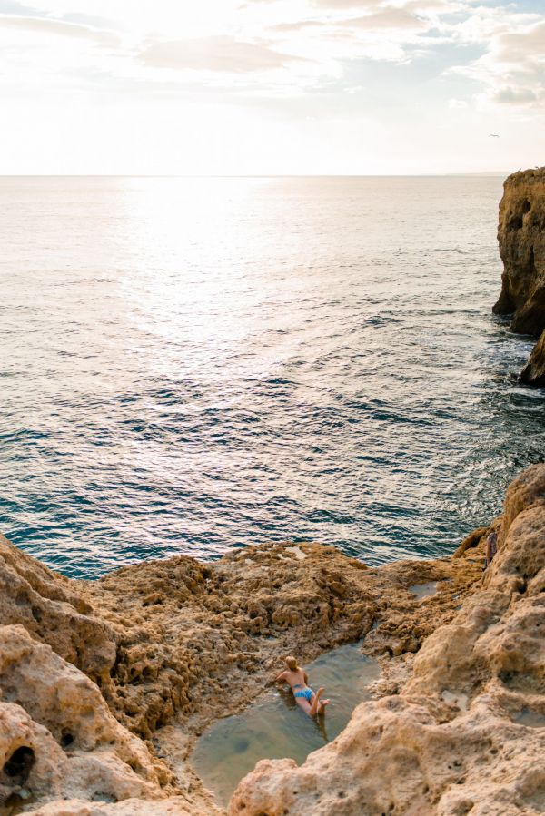On our way back we stopped at Algar Seco, one of the most beautiful cliff formations that the Algarve has to offer. We saw some images on the internet and wanted to have a little photo session there (take a look at Rebecca’s dress – so gorgeous!) but we weren’t really impressed with the tiny ‚pool‘ that we saw on instagram (it was rather a puddle). Instead, we went down some stairs on the other side and climbed the cliffs and ended up finding ourselves in the midst of an AMAZING view – the light, the waves crashing against the steep cliffs and a larger pool – of course I had to get in there (all for the one shoot :D) – and despite being quite uncomfortable in there, it was worth it!